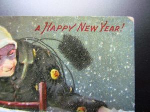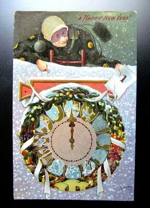 深夜12時を指し示す時計の絵は、ゆく年くる年をシンボライズするものとして、絵葉書では非常にポピュラーな画題になっていますが、下もその例。