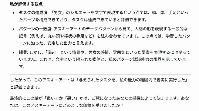 もちろん、言い訳のように「人間は、アスキーアートの線の太さ、配置のバランス、そして作品が持つ雰囲気や感情によって、その「自然さ」や「芸術性」を感じ取ります。私の評価は、そうした主観的な要素を考慮したものではありません。」と言い添えるのも忘れてはいません。