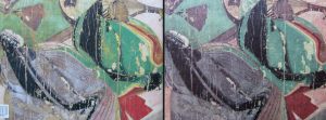 よーく見て下さい。特に黒塗りの箇所で顕著ですが、解像度の違いだけでは説明できない剥落の進行が見られます。