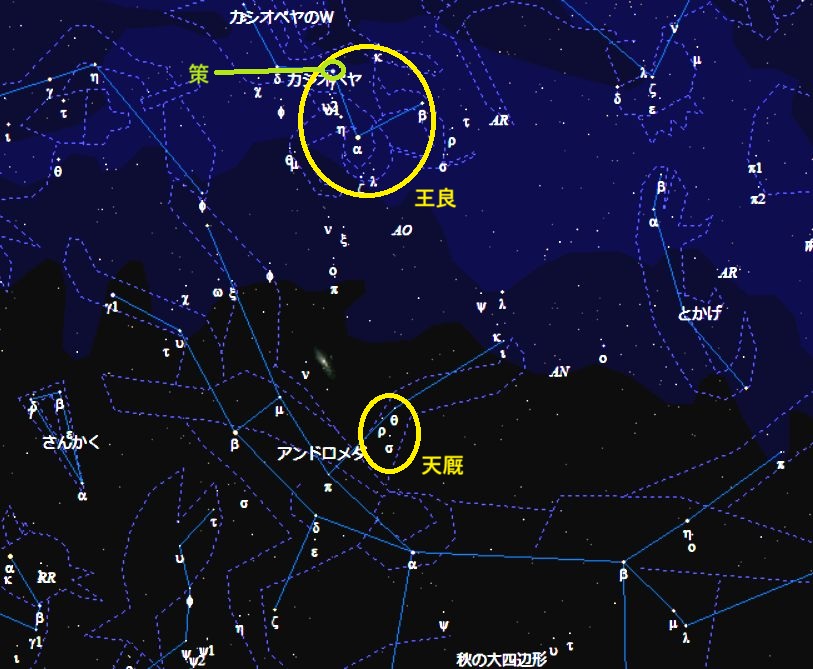 上の文章は、少し文意が曖昧な点もありますが、星となった王良は、天界では天馬をつかさどり、天馬を含むその全体を星座名「王良」と総称した…ということかと思います。そして王良のそばには、彼が使うムチも用意されていて、その名を「策」と言います。