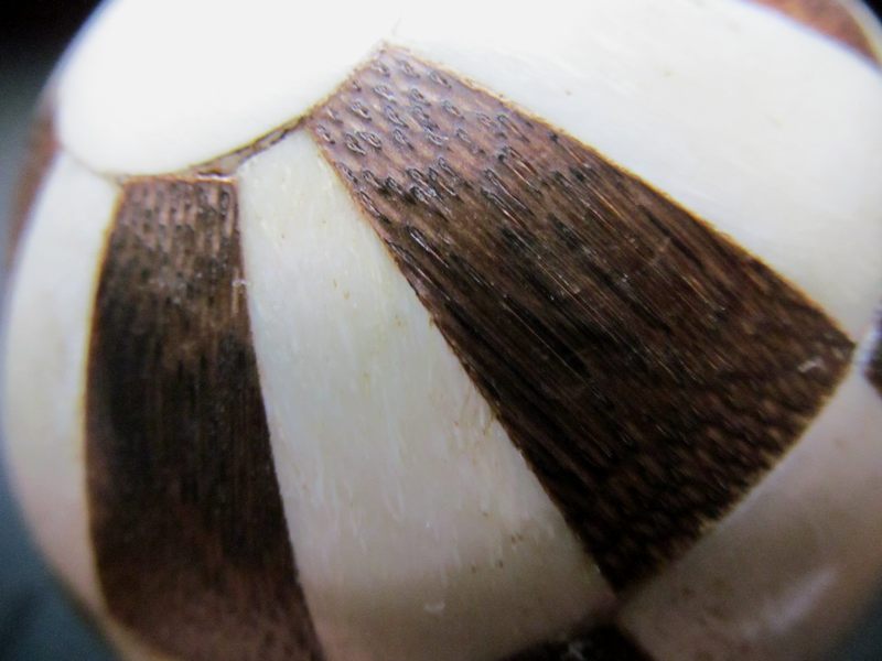 この市松模様は芯まで嵌入しているのではなく、動物の骨角と褐木を薄片にして、球体に貼り付けてあるようです。