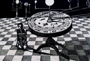 黒白だんだらの市松模様と漆黒の宇宙図の対比は、いかにも謎めいた「不穏な静謐」を漂わせています。