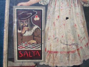 サルタは大層流行ったので、パッケージデザインにもバリエーションがあって、当初はこの思案する男のデザインの箱でしたが、手元の品はそれを少女に持たせた新デザイン。なかなかひねりが効いてます。