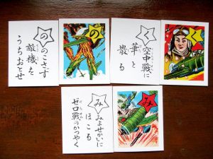 上段は「い」から始まり、「いろはかるた」の形式を踏襲していることがわかります。下段の方は「う(ゐ)のおくやま…」と続きますが、戦後なので、「ゐ」の札は含まれません。